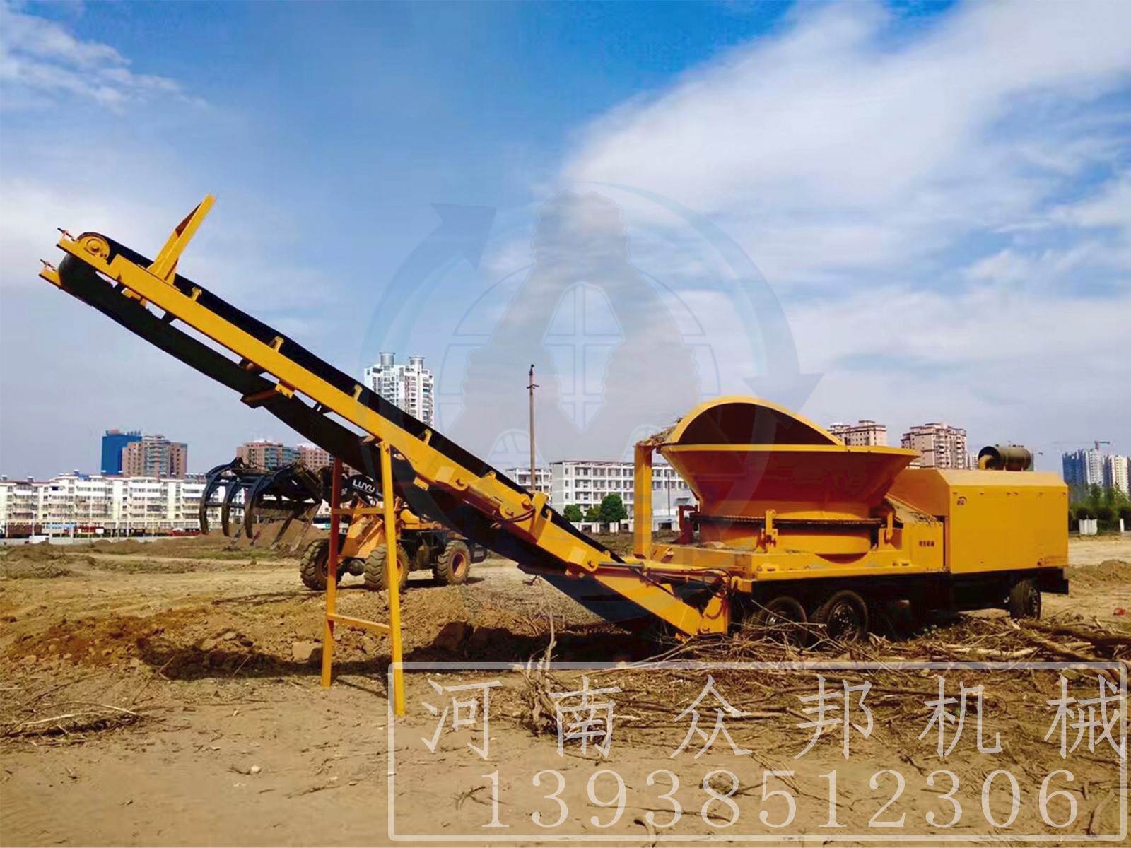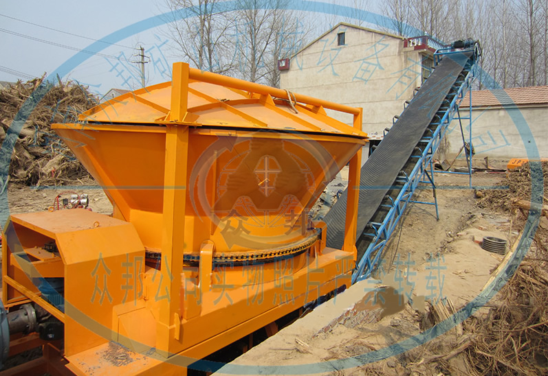 大型木材綜合破碎機工作時,由電機帶動轉子進行高速旋轉,同時進料斗也在電機的帶動下進行緩慢的旋轉,物料經抓機投放進料斗,料斗在旋轉的同時內壁上的撥料齒會將物料均勻的撥到轉子上,高速旋轉的轉子碰到物料經由轉子上刀片的切削和撕扯實現(xiàn)物料的初步破碎,進過初步破碎的物料無在自身重力和轉子沖擊力的作用下掉在破碎腔內的篩網上,符合要求的物料會通過篩網排出,而不符合要求的會在破碎腔內進行二次甚至三次的破碎加工直至符合要求。