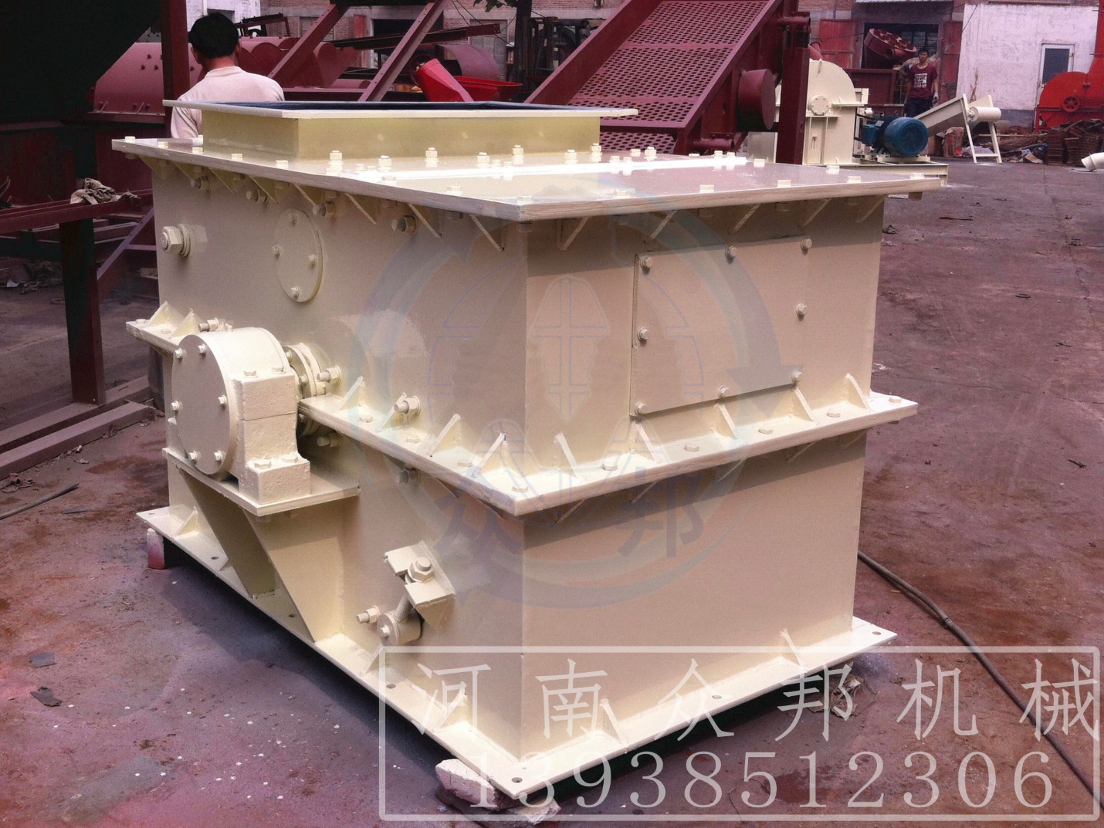 環(huán)錘式破碎機(jī)的工作部件為帶有錘子(又稱錘頭)的轉(zhuǎn)子。轉(zhuǎn)子由主軸、圓盤、銷軸和錘子組成。電動機(jī)帶動轉(zhuǎn)子在破碎腔內(nèi)高速旋轉(zhuǎn)。物料自上部給料口給入機(jī)內(nèi),受高速運(yùn)動的錘子的打擊、沖擊、剪切、研磨作用而粉碎。在轉(zhuǎn)子下部,設(shè)有篩板、粉碎物料中小于篩孔尺寸的粒級 通過篩板排出,大于篩孔尺寸的粗粒級 阻留在篩板上繼續(xù)受到錘子的打擊和研磨,通過篩板排出。